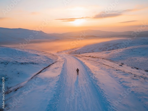 Snowy landscape at sunset with a winding road