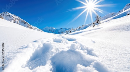 snow, mountain, sun, winter, landscape, blue skies, nature, serene, outdoors, calmness, hiking, adventure, cold, escape, exploration, footprint, scenery, bright, beauty, sunlight, glacé, peaceful, calm, altitude, pristine, weather, environment, wilderness, fresh air, scenic, journey, wonderland, leisure, natural beauty, slope, pattern, brightness, immensity, radiance