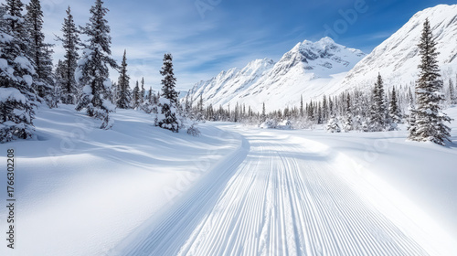 Snowy landscape, winter scenery, mountain range, pine trees, blue sky, peaceful atmosphere