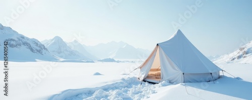 Snowy landscape with a simple white tent on a vast white background, wilderness, snowflake