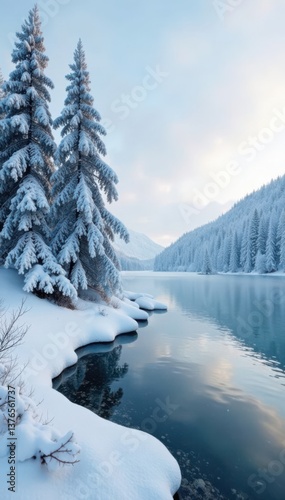 Snowy landscape with frozen trees and frosty lake, white snow, frosty lake