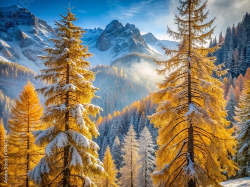 Snowy Larch Forest Panorama: Long Exposure Photography, Winter Wonderland, Larch Trees, Snow Covered Branches