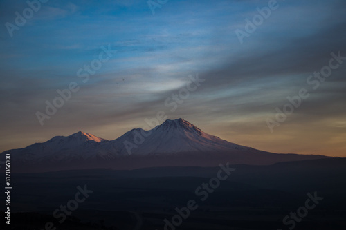 Snowy Mount Hasan Volcano Anatolia Turkey Aksaray Sunset Pink Red Orange Sky