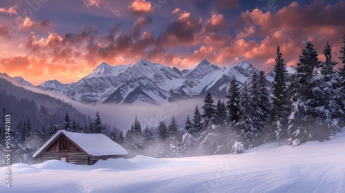 mountain, cabin, snow, winter, sunrise, forest, tree, sky, nature, landscape, fog, frost, cloud, pine, coniferous, alpine, snowy, peak, horizon, scenery, view, outdoors, travel, photo, beautiful, serenity, peace, calmness, peaceful, idylli, rural, rustic, cold, glacé, white, blue, orange, pink, red, gold, light, dawn, morning