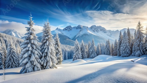 Snowy mountain landscape with trees covered in snow, winter, cold, frosty, scenic, white, frozen, serene, icy, snowy