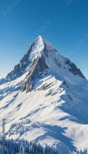 snowy mountain peak under a clear blue sky, majestic landscape, winter theme