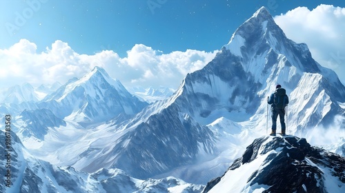 Snowy mountain peak view, with a standing mountaineer man with a backpack, panorama