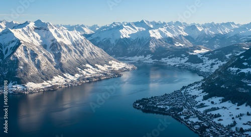mountain, lake, winter, snow, landscape, nature, aerial, view, water, peak, snow-covered, mountain, alpine, vale, scenic, travel, holiday, vacation, cold, calm, clear sky, sunny, day, beautiful, panorama, panoramic, wide, image, background, copy space, digital, photo, editorial, commercial