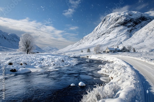 winter, snow, mountain, vale, river, house, landscape, nature, cold, ice, sky, cloud, tree, road, scenic, season, white, blue, rural, serene, peaceful, travel, weather