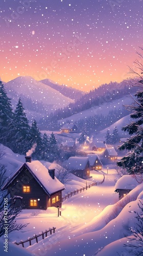 snow, mountain, village, cabin, sunset, winter, sky, tree, forest, pink, purple, evening, light, dusk, cold, frost, glacé, landscape, nature, peaceful, quiet, serene, cosy, home, warm, chimney, window, wooden, fence, path, white, falling, flake, cute, background, snowy, soft, snowflake, pastel, colours, colours, still, christmas, red, idylli, jan, wood, icy, graphic
