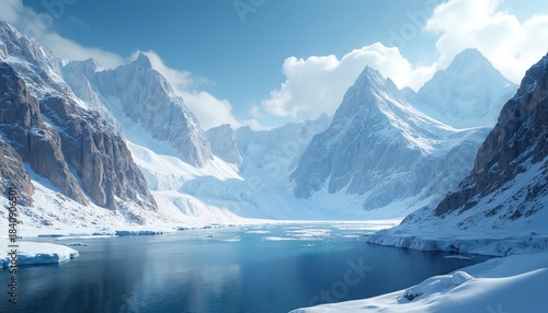 Snowy mountains overlook icy blue water and glaciers. Vast winter landscape shows pristine nature and remote frozen wilderness. Calm serene scenery with sky and clouds.