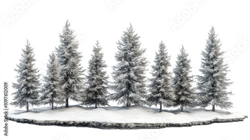 Snowy Pine Trees in Winter Landscape on White Background