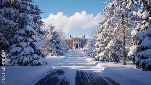 Snowy residential avenue with evergreens leading to a grand mansion.