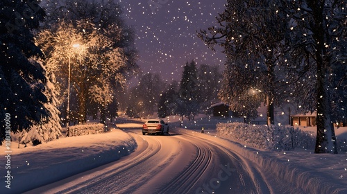 Snowy road in the countryside, trees on both sides of the street, car driving down the snowy road, snow falling from the sky, nighttime, photorealistic.