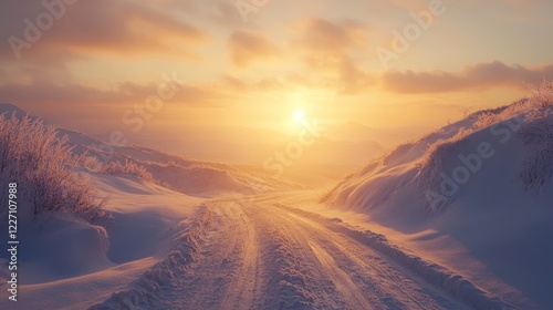 Snowy road sunset winter landscape, serene travel scene