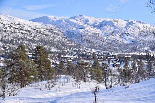 Snowy scenes in Hovden, Norway. Ski tracks on the ground, with Mountains and trees behind. Snow covered houses and blue skies. Bluebird weather.