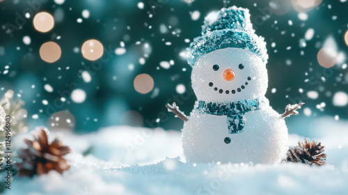 Snowy snowman wonderland with festive bokeh lights and pinecones