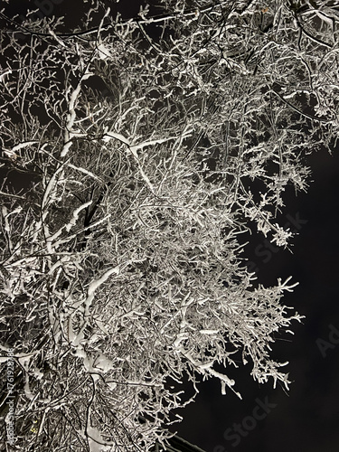 Snowy Tree Branches at Night with Heavy White Snow against Black Sky
