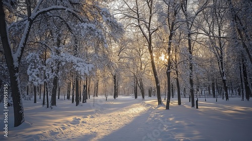 Snowy trees in a Moscow park create a stunning winter wonderland.