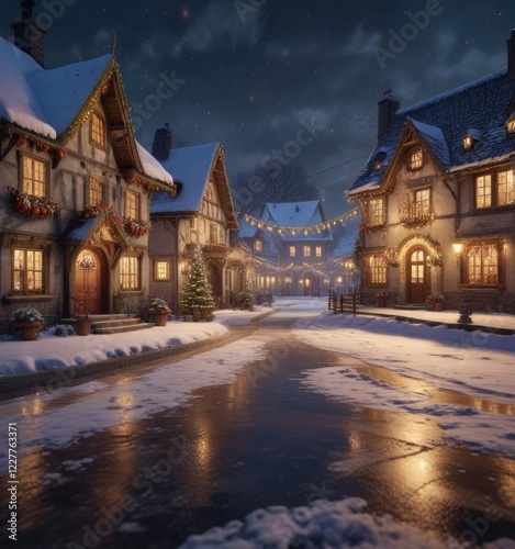 Snowy village square with festive decorations and Christmas lights, frosty scenery, festive village square