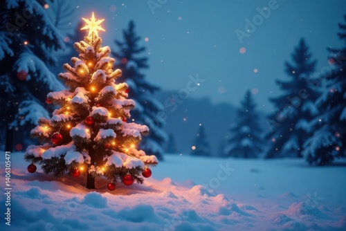Snowy winter landscape with Christmas tree and lights , festive, lighting