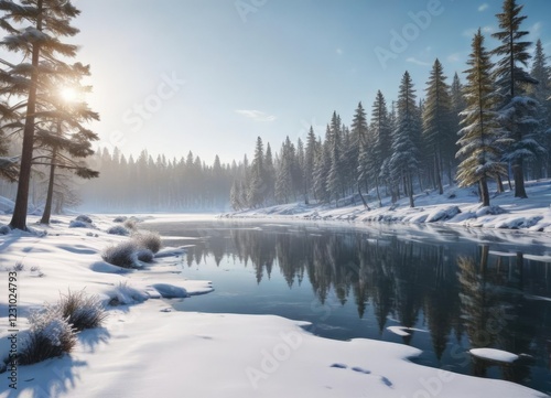 Snowy winter landscape with frozen lake and pine trees, snow covered pine trees, frozen lake landscape, serene snowy winter landscape