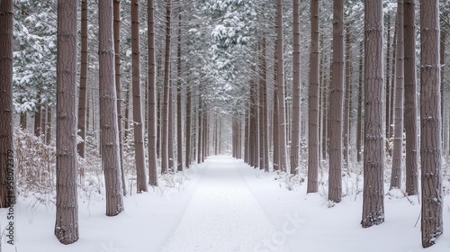 Snowy winter landscape with pine trees and a path covered in frost