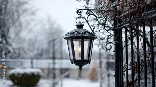 lantern, winter, snow, frost, cosy, decorative, black, ornate, serene, vine, lighting, nature, cold, atmosphere, tranquil, scenic, landscape, peaceful, home, urban, evening, soft light, glacé, gate, garden, winter landscape, moody, ambience, night