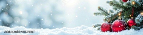Snowy winter scene with a festive Christmas tree and ornaments against a soft white background , christmas tree, white background