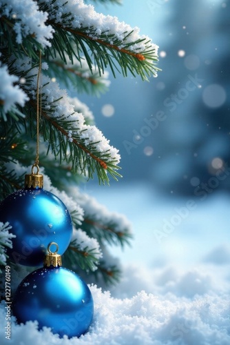 Snowy winter scene with pine sprigs and blue ornaments, arrangement, holiday decoration
