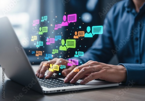 SNS chat messages and communications. Analysis of social media communication for marketing. Marketer using laptop computer to analyze social media trends.