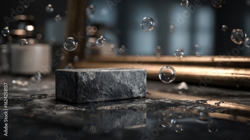 soap, bubble, luxury, floating, textured, dark, glossy, surface, closeup, elegant, mirror, sophisticated, clean, cleansing, bathe, bathroom, hygiene, beauty, skincare, wet, artistic, minimalistic, aesthetic, interior, design, blur, shiny, stylish, relaxing, tranquil, pampering, decorative, modern, refined, classic, serene