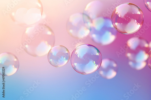 Soap bubbles floating in the air on pastel gradient background. Iridescent bubbles. Dreaming, fun and joy concept. Abstract pc desktop wallpaper. Cleaning and washing theme