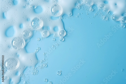 Soap foam, blue water surface texture with bubbles and splashes. Clear water abstract nature background, copy space for text