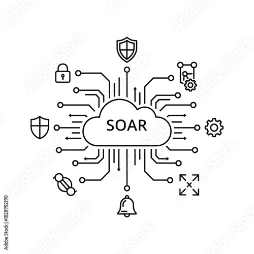 fly up, security, orchestration, automation, response, cyber, cloud, technology, network, digital, datum, protection, system, cyberspace, information technology, information, threat, incident, management, operation, intelligence, analysis, defense, safeguard, privacy, secure, shield, lock, gear, bell, alert, monitor, control, process, workflow, platform, infrastructure, solution, service, concept, diagram, symbol, line, outline