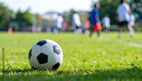 Soccer ball lying on grass field with blurred soccer players training in the background