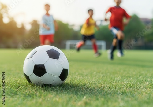 Soccer ball lying on grass field with young asian players running in the background during a sunny day