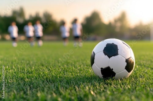 Soccer ball on green grass with players in the blurred background during practice on a sunny day