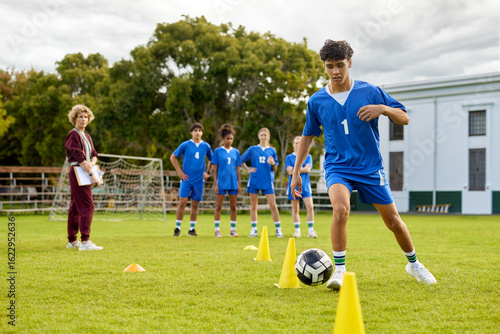 training, football, sport, soccer, player, field, student, practice, dribbling, ball, team, coach, coaching, train, match, cone, athlete, together, woman, skill, agility, trainer, game, play, playing, people, group, mature, young, man, school, guy, girl, teenage, teenage, physical, education, teacher, preparation, progress, athletic, physical exercise, active, class, energy, determination, action, performance