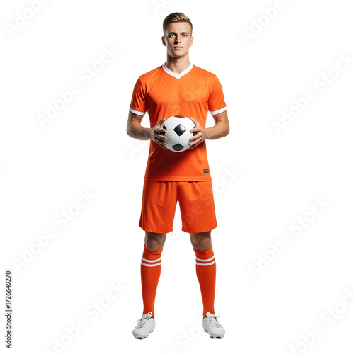 Soccer player stands holding ball orange jersey white trim matching shorts socks white cleats on white or transparent background