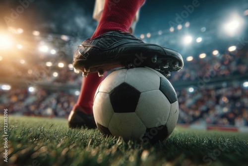 soccer, football, sport, game, stadium, night, light, player, foot, ball, competition, athletic, action, energy, dynamic, crowd, spectator, field, grass, professional, championship, match, victory, goal, succeed, team, sportsmanship, power, skill, sharpened, intensity, passion, excitement, achievement, tournament, athleticism, strategy, dedication, training, fitness, performance, success