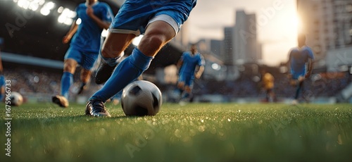 soccer, player, blue, action, sport, game, field, grass, ball, running, foot, leg, goal, stadium, crowd, city, sunlight, evening, blur, sharpened, movement, competition, teamwork, athletic, energy, dynamic, fast, skill, team, match, sportsmanship, effort, exertion, concentration, determination, victory, sporty