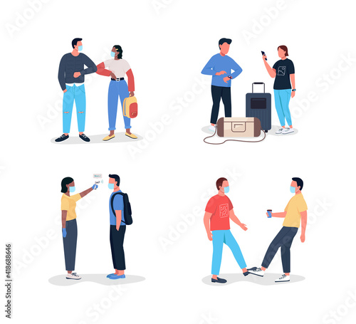 Social distance flat color vector faceless character set. Way to greet friends during covid pandemia. Virus prevention isolated cartoon illustration for web graphic design and animation