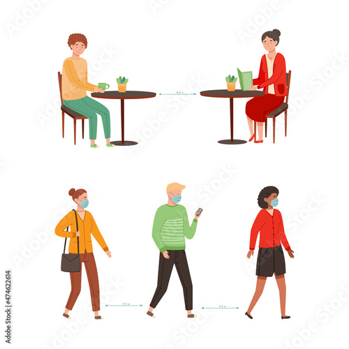 Social distance in public places set. People wearing mask to prevent infection from coronavirus COVID-19 vector illustration