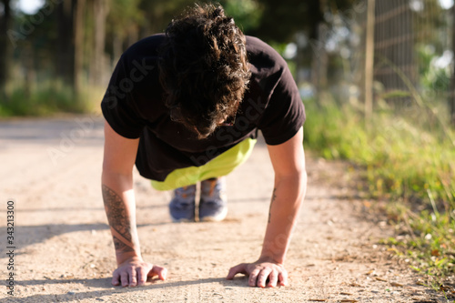 Social distancing - Caucasian man doing push-ups outside to maintain good mental health, wearing a black t-shirt and green shorts and with tattoos in his arms
