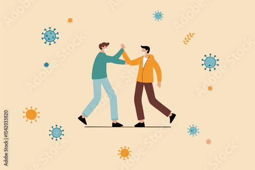 elbow, distance, greet, bump, touch, social, handshake, gesture, friends, contact, illustration, tap, stop, adieu, virus, society, patient, mask, health, people, risk, avoid, man, concept, happy, hand, lifestyle, person, disease, disease, quarantine, disease, pandemic, flu, sanitary, infected, arm, protection, contagious, infect, alternative, novel, outbreak, outside, public