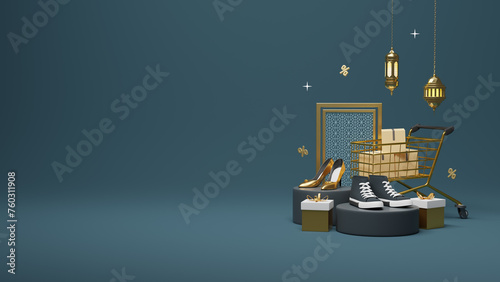 Social Media Islamic greetings and Sale Post design template. 3d rendering shoose, hanging lantern and Islamic orment.