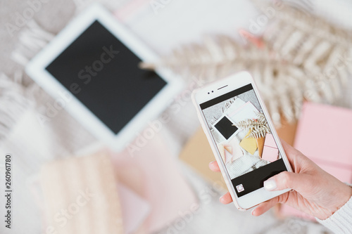 Social media user. Hobby and lifestyle. Like to profile. Woman taking smartphone photo. Freelance. Comfy home workplace.