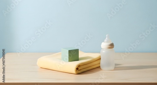 baby, newborn, infant, children, bottle, feeding, blanket, soft, textile, block, toy, wooden, cube, essential, care, routine, daily, hygiene, gentle, calm, serene, simplicity, minimalist, clean, fresh, pastel, blue, yellow, green, white, light, wood, background, tabletop, studio, product, object, nurture, well-being, parenthood, motherhood, family, innocent, tender, cosy