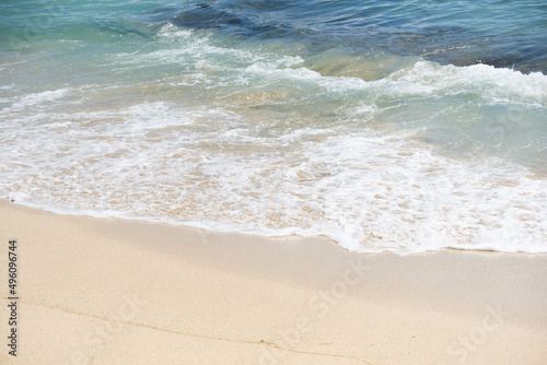 Soft blue oceans wave with foam and clear white sand. Tropical beach by the ocean